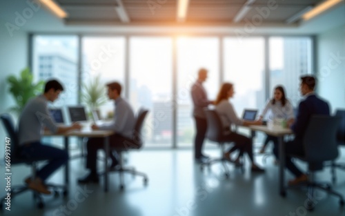 Abstract blurred interior modern office space with business people working banner background with copy space. High quality