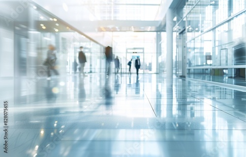 Abstract blurred modern office interior with white walls and glass doors, featuring light reflections on the floor and blurred motion of people walking.