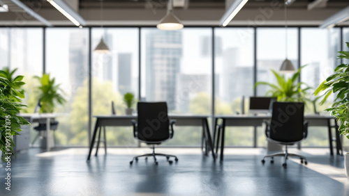 Abstract Blurred Office Interior Modern Workspace with Natural Light and Professional Ambiance.