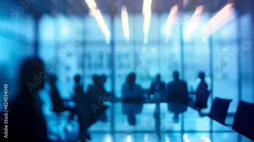 Abstract blurred shot of a diverse group of business people in a meeting room, emphasizing collaboration and teamwork.