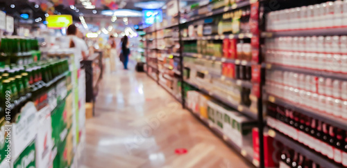Abstract blurred supermarket aisle with colorful shelves and unrecognizable customers as background.