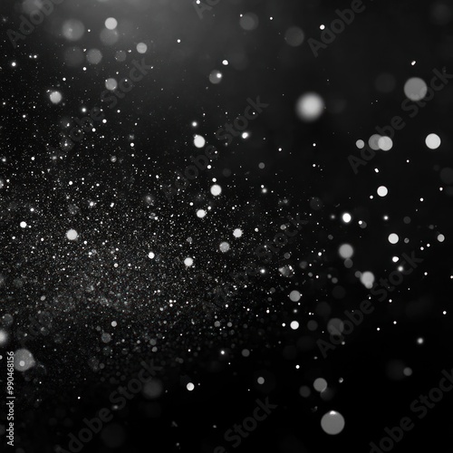 Abstract bokeh background with white and silver glitter particles on black backdrop.