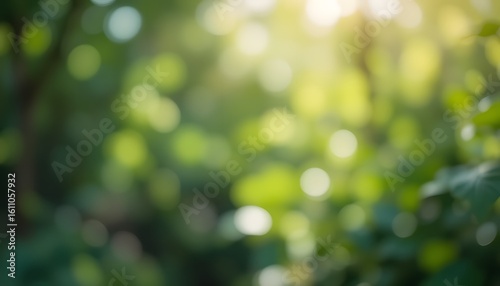 Abstract bokeh image of green foliage with sunlight filtering through the leaves, creating a soft, blurry, and dreamy effect.