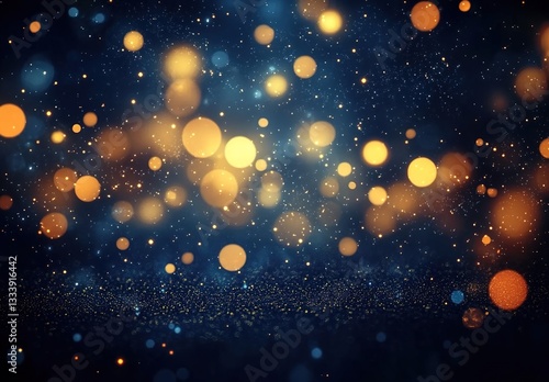 Abstract bokeh lights on a dark blue background with golden glitter, a vintage luxury background for Christmas and New Year celebrations.