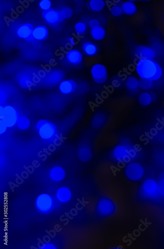 Abstract bokeh of neon blue lights on a dark background