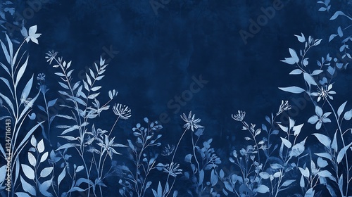 Abstract botanical border, dark blue background, delicate floral design, wall decor