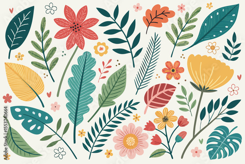 Abstract botanical collage with colorful hand-drawn flowers and leaves seamless vector floral pattern in modern minimalist style, Vector modern graphic illustration of colorful flowers and leaves