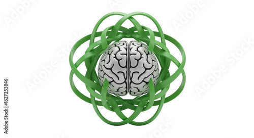 Abstract Brain surrounded by Green Ribbons on Transparent Background
