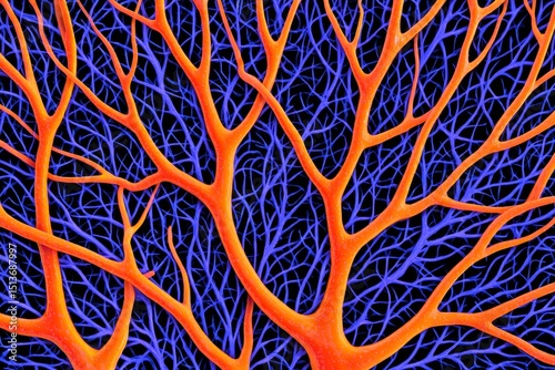 Abstract Branching Network - Intricate network of branching lines, vibrant orange and blue, against black background. Abstract art, complex structure