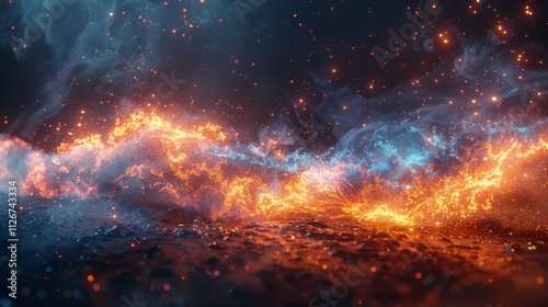Abstract Burning Fire, Blue Smoke, and Sparks. Digital Art of Cosmic Energy, Power, and Explosion.