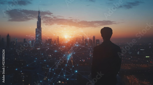 Abstract business man stands on Smart digital Innovation city with connection network reciprocity over the twilight cityscape. of future wireless digital city and social media networking systems