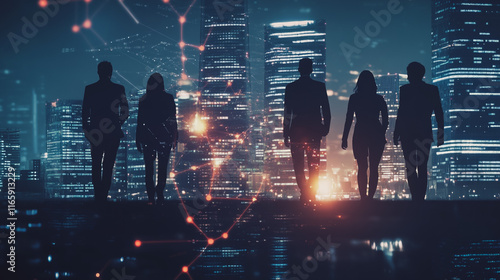 Abstract business team stands on the peak of success amid tall, innovative Smart city and graphs with statistics to analyze business potential and predict future developments in company growth.