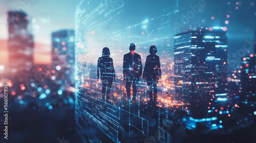 Abstract business team stands on the peak of success amid tall, innovative Smart city and graphs with statistics to analyze business potential and predict future developments in company growth.