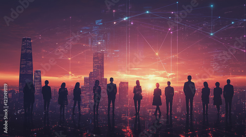Abstract business team stands on the peak of success amid tall, innovative Smart city and graphs with statistics to analyze business potential and predict future developments in company growth.
