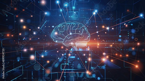 Abstract business technology background with AI and machine learning icons integrated into a digital grid