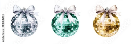 Abstract Christmas Ornaments: Metallic Disco Balls in Chic Green, Gold, and Silver Illustrations