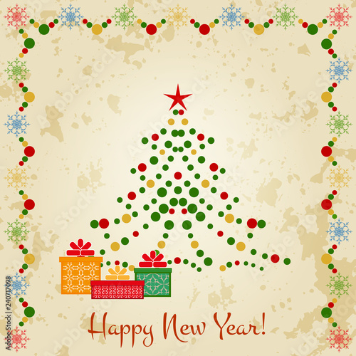 Abstract Christmas tree with colored balls and gifts. Grunge style background. Happy New Year 2019 and Merry Christmas. Postcard for the New Year, Christmas. Poster, template. Vector illustration.