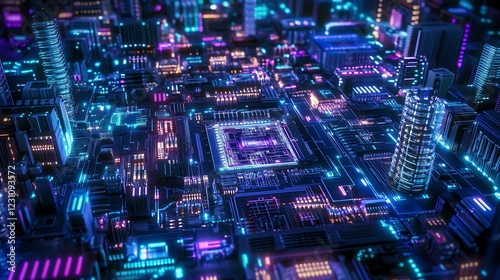 Abstract circuit board background with neon blue and purple lights. High-tech digital technology concept, close-up.