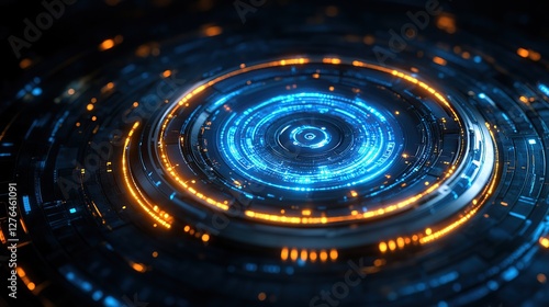 Abstract circular digital design featuring blue and orange glowing elements in a futuristic style