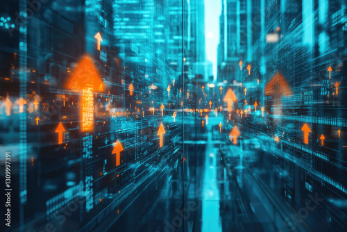 Abstract city landscape with upward-trending data streams, symbolizing technological growth and progress.