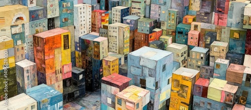 Abstract cityscape illustration with colorful buildings in an urban environment