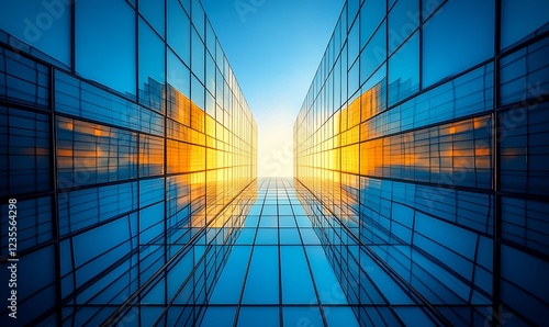 Abstract Cityscape Reflection Blue and Orange Sunset Hues in Modern Glass Architecture