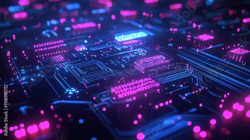 Abstract Close-Up of a Futuristic Circuit Board with Glowing Neon Lights
