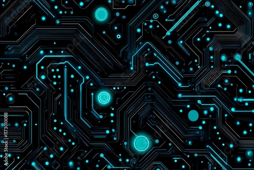 Abstract close-up of a glowing blue digital circuit board, showcasing intricate connections and technological design on a black background.