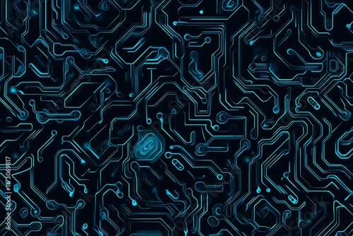 Abstract close-up of a glowing blue digital circuit board, showcasing intricate connections and technological design on a black background.