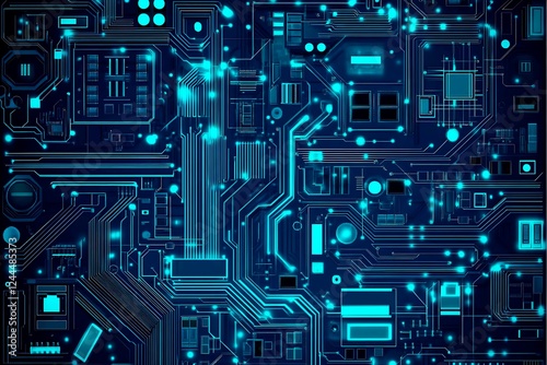Abstract close-up of a glowing blue digital circuit board, showcasing intricate connections and technological design on a black background.