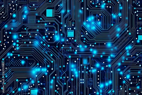 Abstract close-up of a glowing blue digital circuit board, showcasing intricate connections and technological design on a black background.