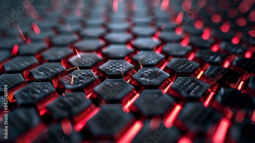 Abstract closeup of carbon fiber material with hexagonal pattern and red highlights ideal for backgrounds and high-tech designs