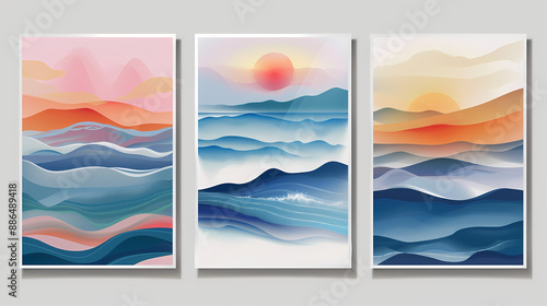 Abstract coloful landscape poster collection. Set of contemporary art print templates. Nature backgrounds for your social media. Sun and moon, sea, mountains, ocean, river bundle