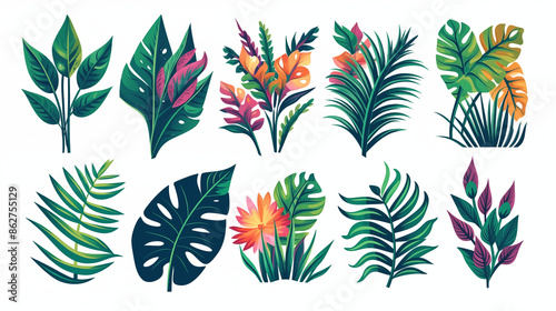 Abstract color leaves isolated on white collection. Tropical leaves set.