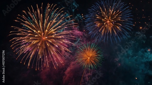 Abstract colored fireworks background with beautiful fireworks lighting up the night sky. Bokeh effect