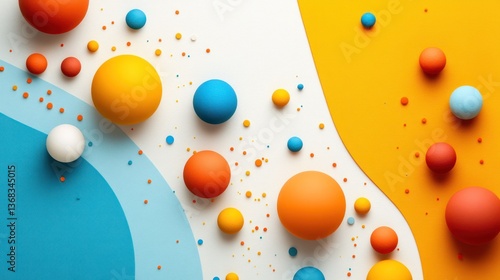 Abstract colorful balls and dots on a white background with orange and blue gradients.
