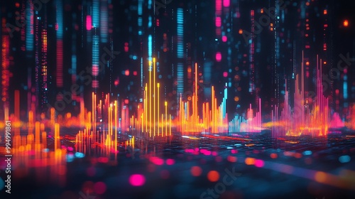 Abstract colorful digital waveform with bright neon colors against a dark background, creating a vibrant visual flow.