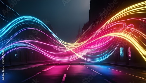 Abstract Colorful Light Gradient Wave Motion on Dark Background: Stunning Neon Glowing Lines in Night Scene"