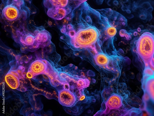 Abstract Colorful Microscopic View of Cells with Glowing Nuclei
