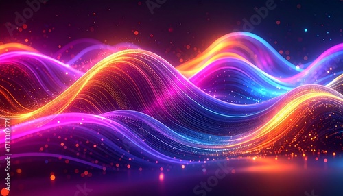 Abstract Colorful Neon Light Waves with Glowing Energy Lines and Particles on Dark Background