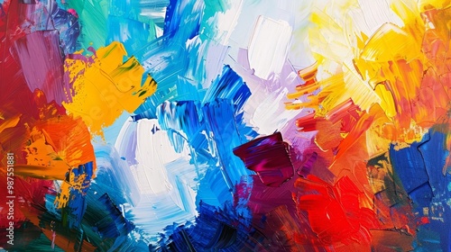 Abstract colorful oil painting on canvas with bold strokes and vibrant hues.