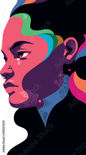 Abstract colorful portrait of female with multicolored hair flat vector illustration