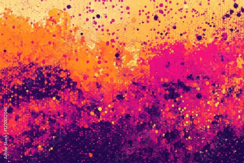Abstract colorful splatter art with vibrant hues of pink, orange, and yellow.