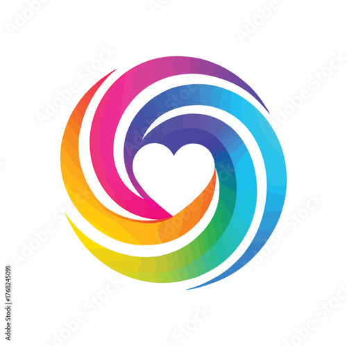 Abstract colorful swirling heart logo design, vibrant rainbow spiral symbolizing love, unity, and connection with a clean, modern aesthetic