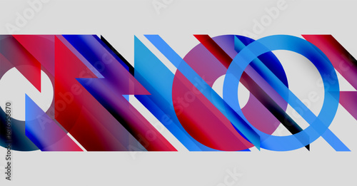 Abstract composition featuring overlapping shapes, vibrant reds, blues, purples. Modern design with dynamic visual impact. Smooth gradients create depth.
