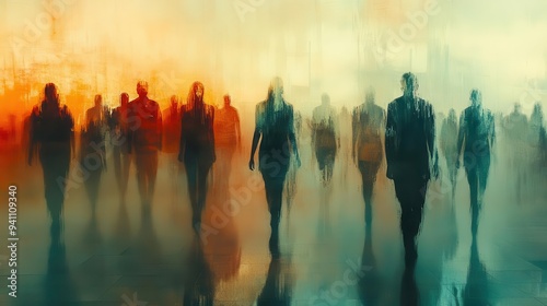 abstract composition of blurred human silhouettes in muted colors conveys sense of movement and anonymity in bustling crowd scene