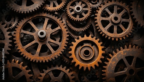 Abstract composition of rusted gears with dark patina, subtle metallic reflections, and rough texture variations for an artsy, industrial background
