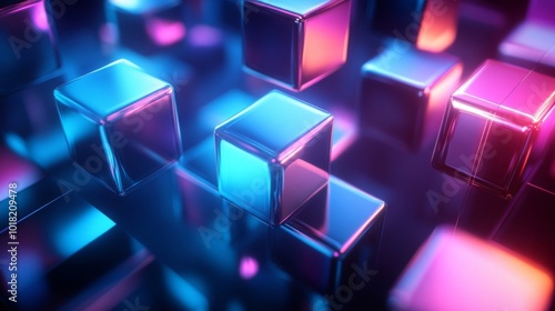 Abstract Composition of Shiny Cubes in Neon Blue and Pink Lighting