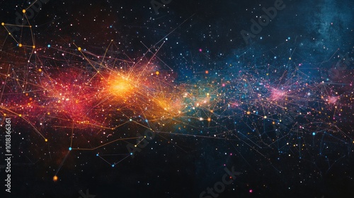 Abstract cosmic background with glowing lines and stars.