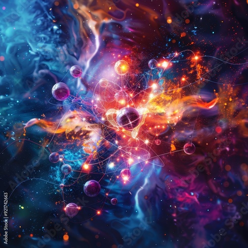 Abstract cosmic background with vibrant colors, nebulae, stars, and glowing orbs.